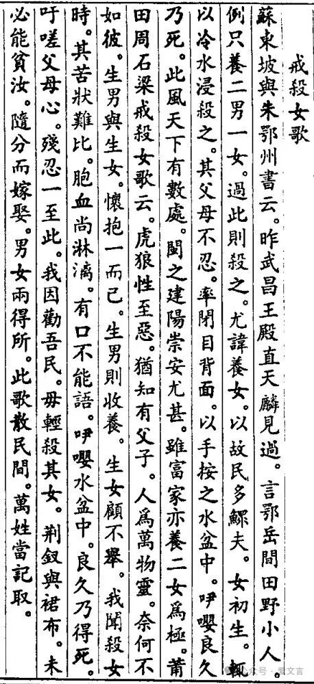 《戒杀女歌》 摘自:坚瓠集(点击图片放大) 原文 蘇東坡與朱鄂州書云。昨武昌王殿直天麟見過。言岳鄂間田野小人。 例只養二男一女。過此則殺之。尤諱養女。以故民多鰥夫。女初生。 以冷水浸殺之。其父母不忍。率閉目背面。以手按之水盆中。呼歠良久。 乃死。此風天下有數處。閩之建陽崇安尤甚。...